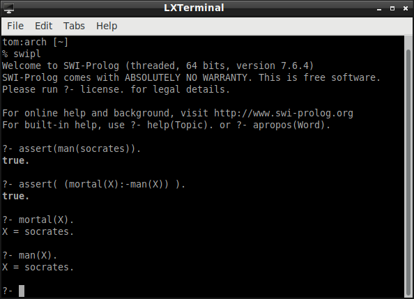 I issue the command "swipl" to start the Prolog interpreter. In response, the interpreter issues the prompt (?-). This prompt signals that the interpreter is ready for a query. When we input a query, this can be understood as giving the interpreter a goal. I give it the goal of adding a fact (that "Socrates is a man" ) and a rule (that "Everything that is a man is mortal") to its KB. The interpreter returns "true" to indicate that it is has satisfied the goal. Now the KB is